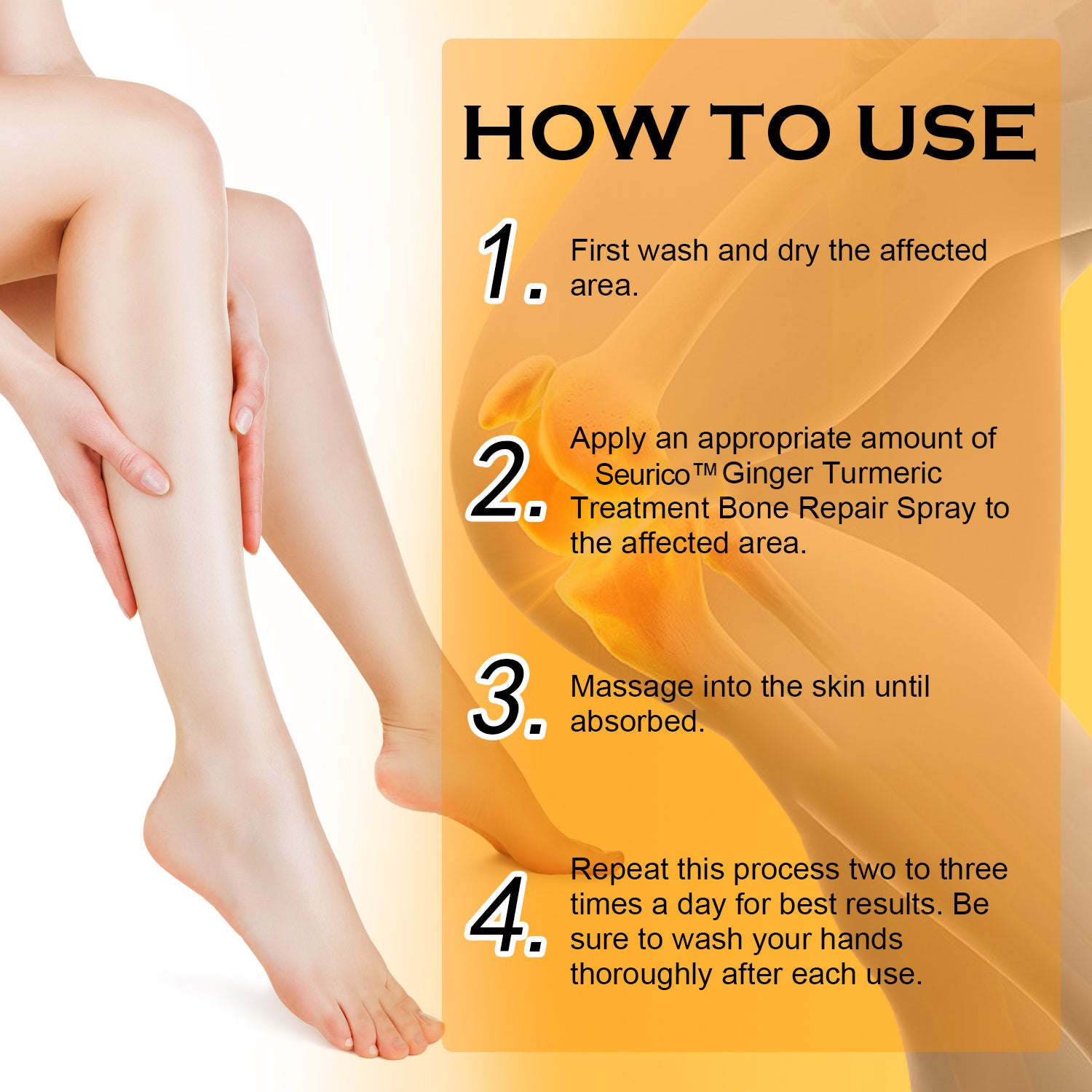 Joints are important parts of our body that we can move. That's why we developed Seurico™ Turmeric Ginger Bone Therapy Spray, which contains extracts such as ginger and black pepper, as well as six natural herbal extracts. These highly active ingredients are concentrated and made into a liquid form. During application, the contact of the joint area with extracts such as ginger and black pepper stimulates bone healing. It is rapidly absorbed into the skin and penetrates deeply, releasing its powerful anti-inflammatory properties directly into the affected inflamed joints and connective tissues. It is capable of treating over 100 arthritis symptoms and a wide range of conditions including varicose veins.